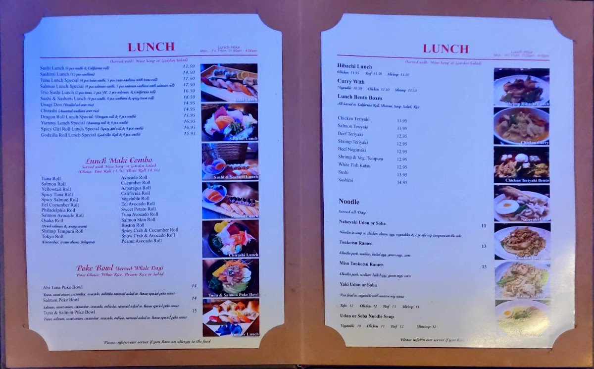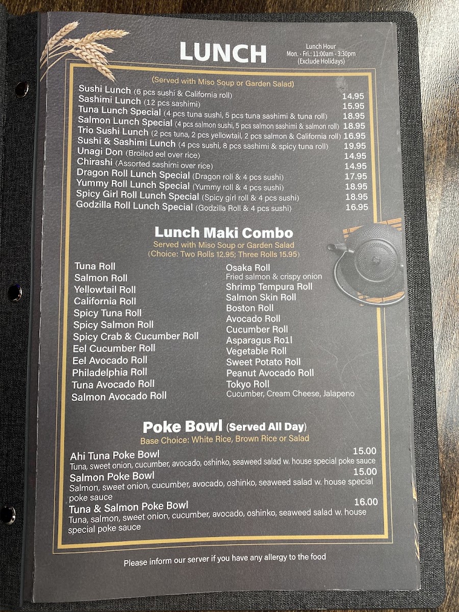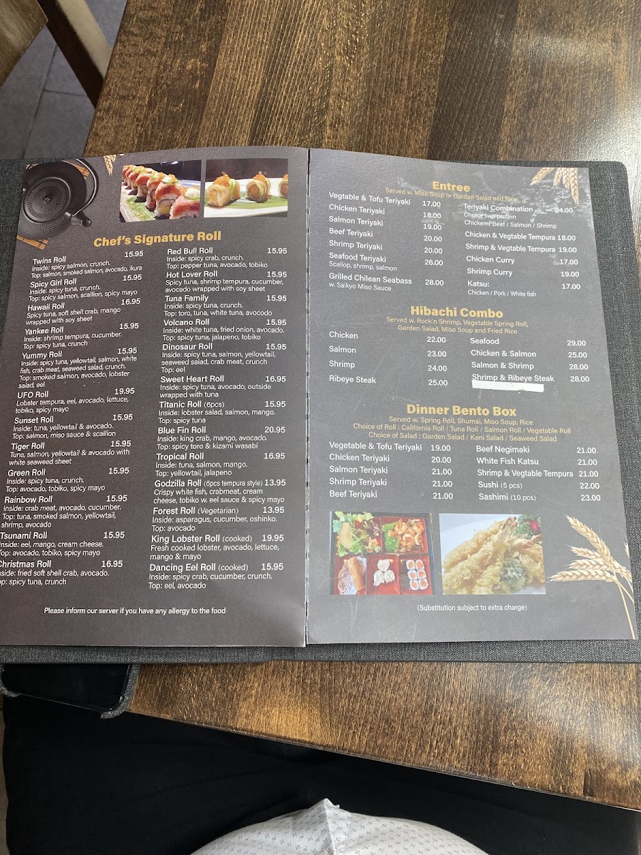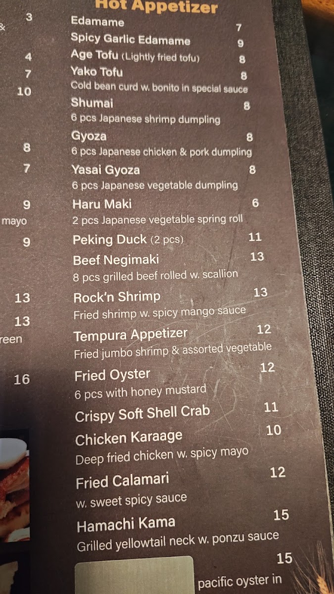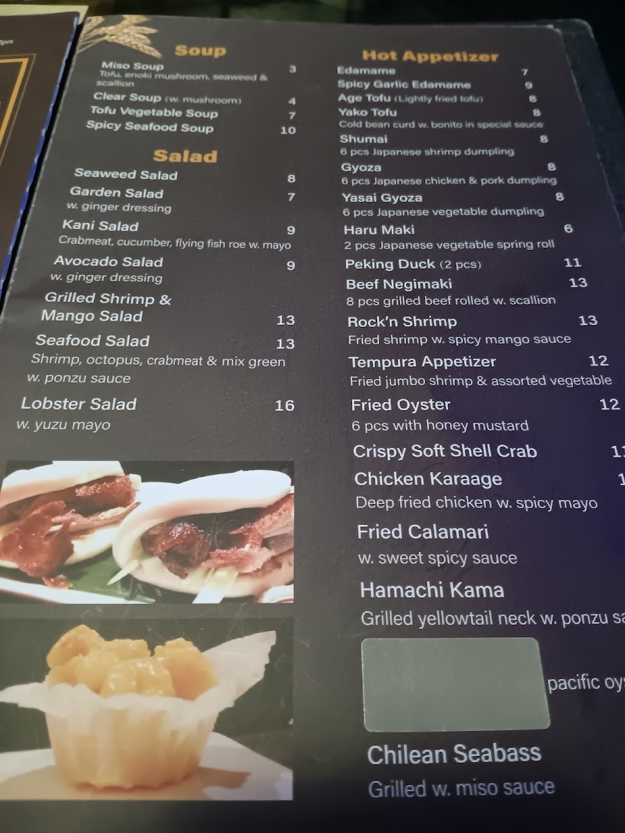 Guests can enjoy a variety of sushi rolls and sashimi selections such as California Roll, Tiger Roll, and Salmon Sashimi, alongside heartier options like Chicken Teriyaki and Peking Duck. The menu also features distinctive bento sets and creative small plates, ideal for sharing or a satisfying solo meal.